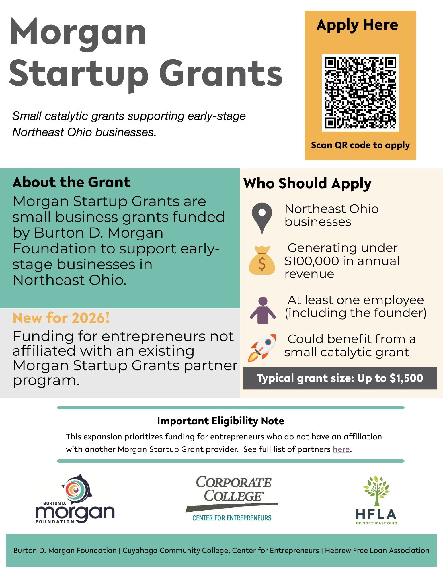 Eligible applicants are Northeast Ohio businesses generating under $100,000 in annual revenue with at least one employee (including the founder). Typical grant awards are around $1,500.